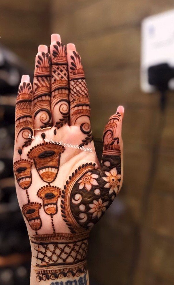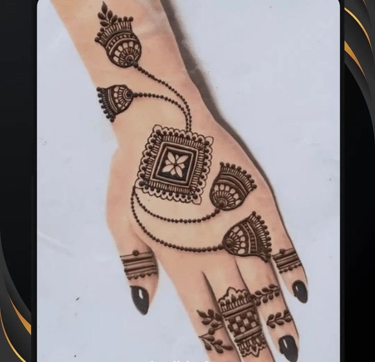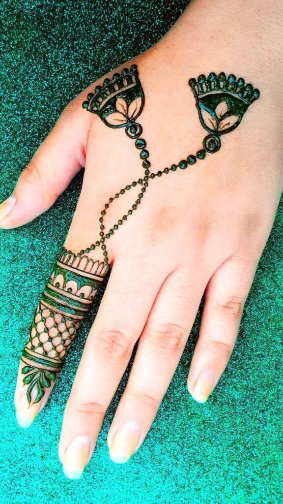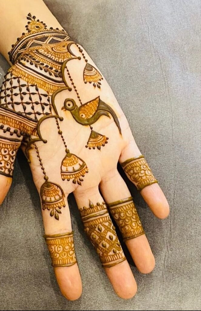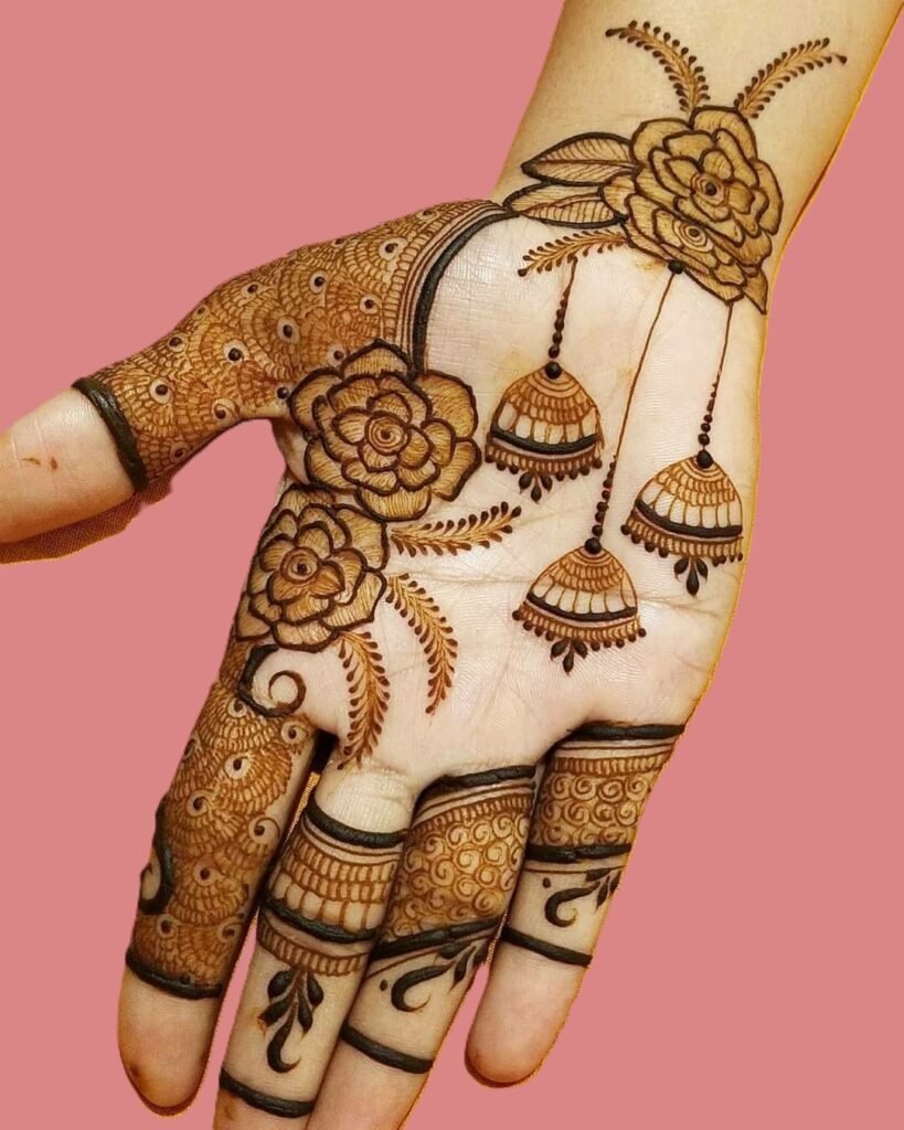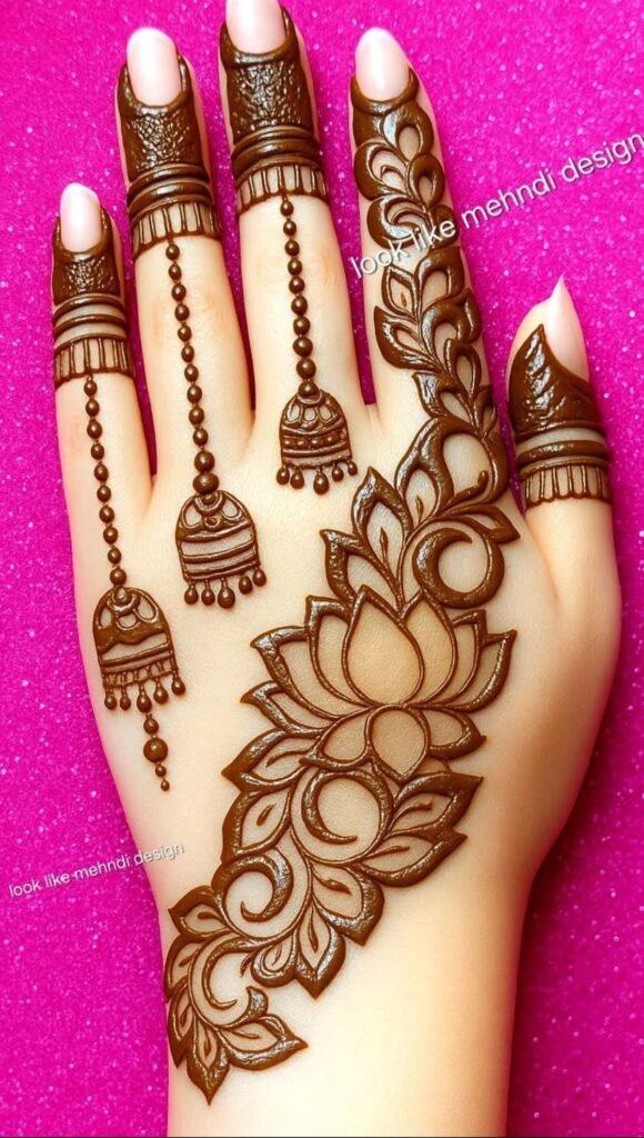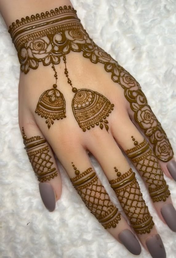 Jhumka mehndi designs are a beautiful fusion of traditional Indian jewelry and intricate henna art. Inspired by the classic jhumka (bell-shaped earrings), these designs feature detailed curves, hanging elements, dots, and fine lines that resemble real earrings. Jhumka mehndi designs are especially popular for brides, bridesmaids, and festive occasions because they add a graceful and luxurious touch to the hands.