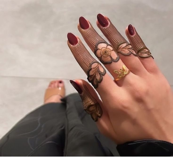 These designs highlight fingers with thin lines, dots, and tiny floral elements. They look elegant and pair beautifully with rings.